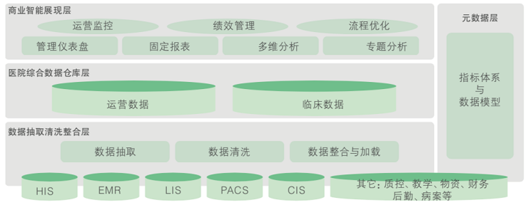 2)信息系統的各個子系統上線于不同的時期,時間跨度比較大,雖然有協作,但需要梳理。醫院現有的查詢、統計數據來源于各個業務系統中各自的報表,醫院難以及時掌控運營全貌,且還存在手工進行一些報表的加工,比如計算、合并等,拖延了決策周期。